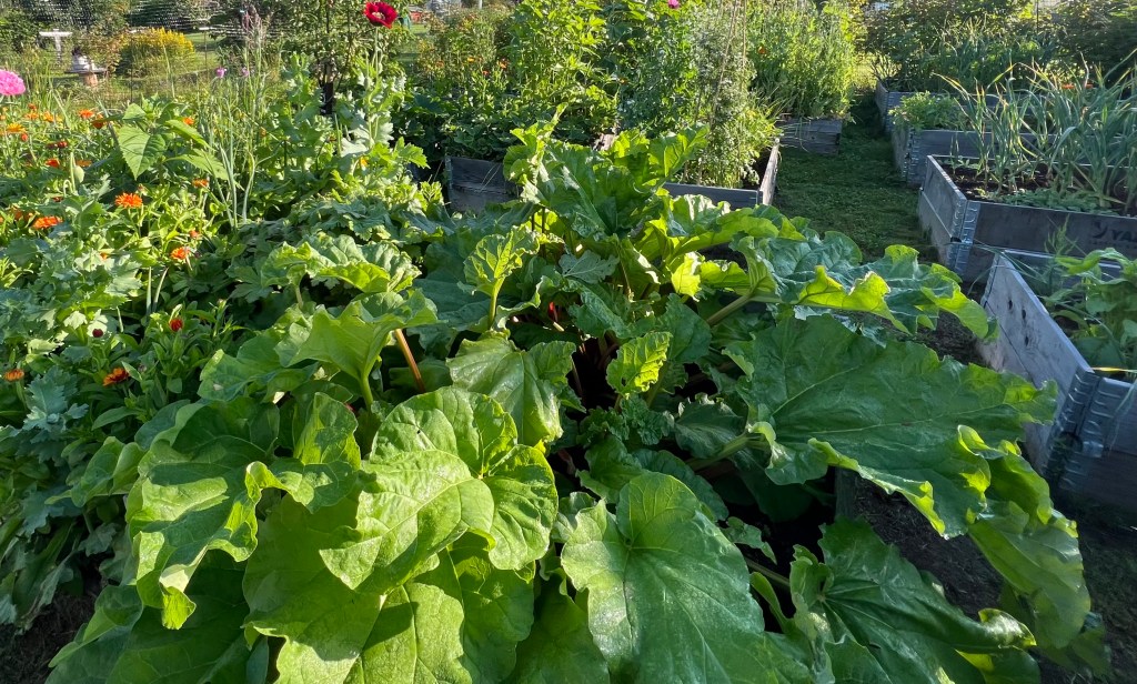 Rhubarb is a crop that keeps on giving. I got one plant from a gardening neighbour almost four years ago. I decided to divide that plant in two, since it was rather big. I planted both of them in one of my larger, deeper raised beds. Every spring I fertilise it with the fertiliser I happen to have on hand, either cow manure or horse manure. In one season I get several crops. As long as one cut the stems that starts to flower the rhubarb keep producing more and more. If you don’t cut off the flowers you only get one big, tasty crop at the beginning of the season, you may get more rhubarb after that as well but it won’t taste as good (if you let it flower.) It is very easy to become self-sufficient in rhubarbs. I always have more than I need. My freezer is usually full of rhubarb, we have an abundance of rhubarb lemonade (SO tasty and refreshing,) and there’s always rhubarb jam. There’s still enough rhubarb leftover to share with friends, neighbours and colleagues, which I very much like to do. What’s your two cents about rhubarb?