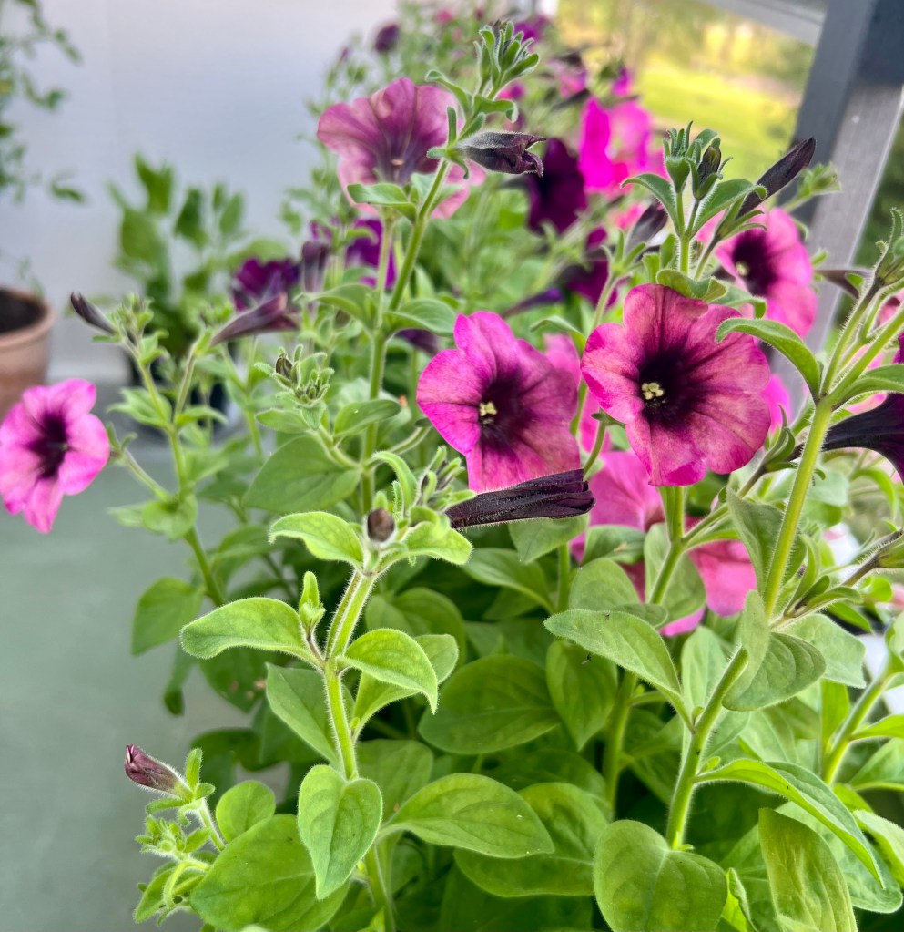 I have three big hanging containers at my balcony. I often grow a mix of herbs in them, but this year a colleague asked me if I wanted some tiny petunia plants. She had been too optimistic when planting seeds and discovered that she had way too many. I said yes, and she gave me two boxes of them. They were tiny, tiny and I would not have known that they were petunias if she hadn’t told me. I repotted them twice, first by separating them, they were all growing in big clusters, and later I planted them in the hanging containers.