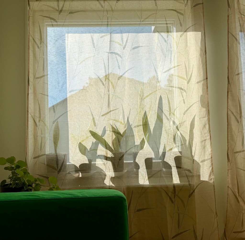 I like the soft light shining through the drapes, and the fact that I can see my plants. I like having large window and the feeling it creates. The apartment feels bigger, and I feel closer to the outdoors. Therefor I want to have light drapes, where I am still able to take advantage of the benefits of the large windows. Before putting up the new drapes I installed mosquito netting for the balcony door, to be able to have it open without getting uninvited guests.