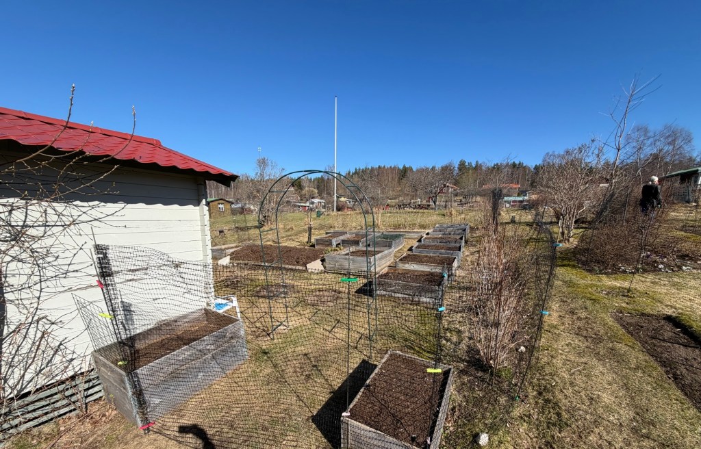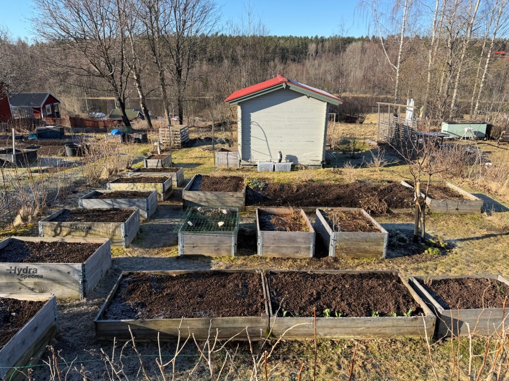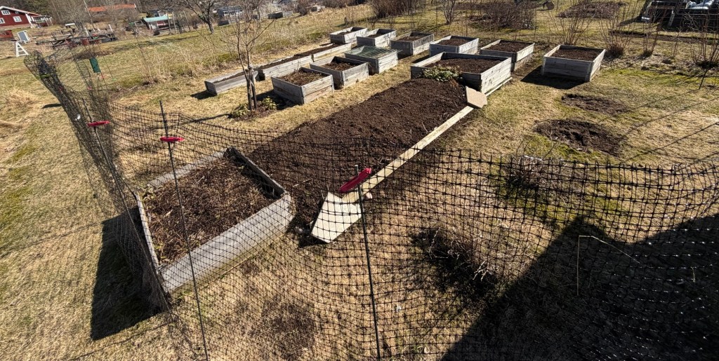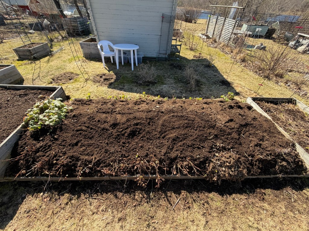 Ever since I made the Hügelkultur bed (the longest bed in the photo above), I’ve struggled with the edges falling apart every year, with soil going everywhere. This year I figure I would plant perennials along the edges that help me keep the bed together. I have suitable perennials (Geranium macrorrhizum, Stachys byzantina) in other parts of my garden that I planned to move there. I told my gardening neighbour about my plans and she said that it would probably work but if I wanted to I could have som Geranium macrorrhizum from her that she wanted to give away, that way I wouldn’t have to move mine. I graciously accepted.