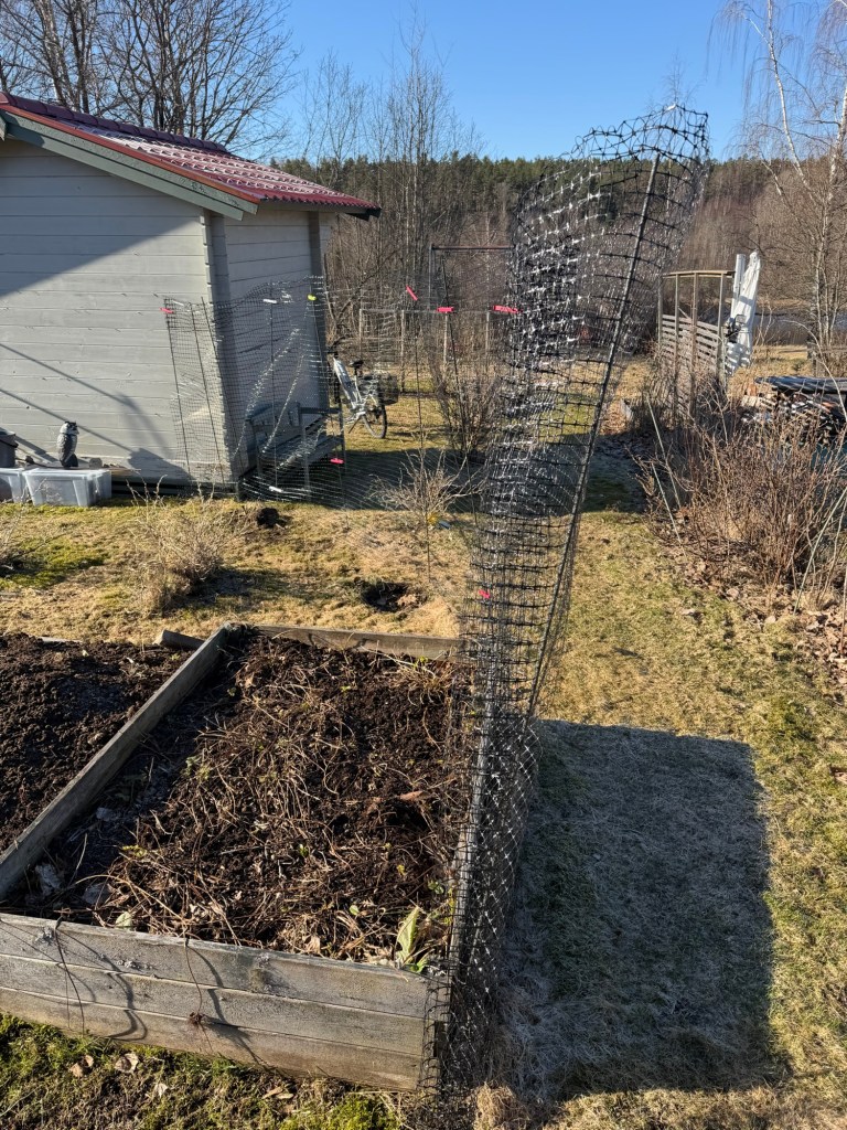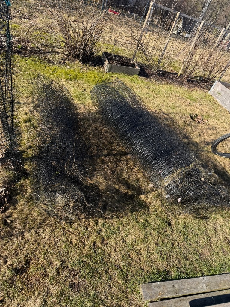 This was what my garden looked like when I arrived this morning. I had a great task at hand, it was time to install the deer fencing. Without it I don’t get to eat anything I grow. I take it down every fall, and put it up again in the spring. I do this for two reasons: I don’t want any animal to get stuck in it during the winter when no one is around, and I also figure it lasts longer if the fence doesn’t have to deal with the weight of the snow every year.